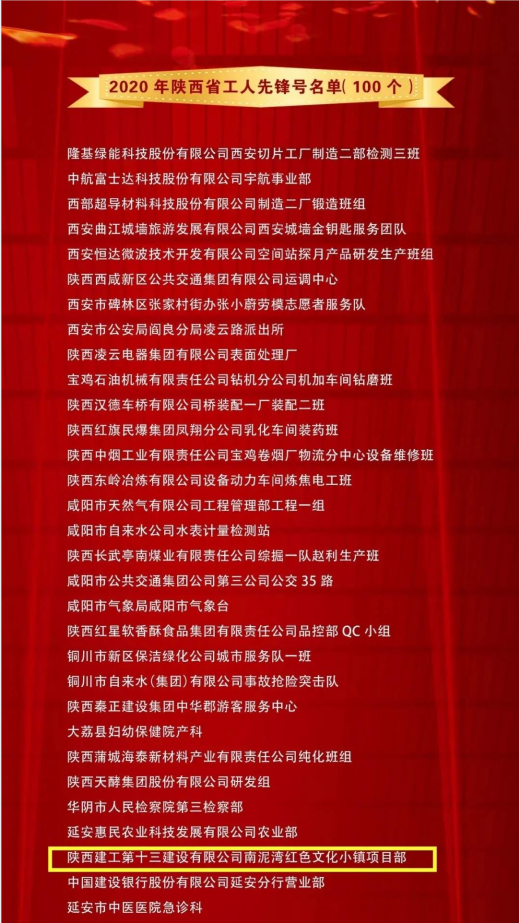 近日,陜西省三秦工匠、五一勞動獎表彰大會在西安隆重舉行,會議表彰了2020年三秦工匠 和陜西省五一勞動獎、工人先鋒號。陜西建工第十三建設(shè)有限公司南泥灣紅色文化小鎮(zhèn)項目部榮獲2020年“陜西省工人先鋒號”榮譽稱號。