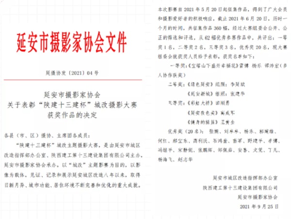 “陜建十三建杯”城改攝影比賽旨在用相機(jī)展示古城風(fēng)貌,以鏡頭凸顯圣地氛圍,展現(xiàn)新時(shí)代之下延安市的發(fā)展之美、和諧之美。影賽自開展以來(lái),得到了廣大攝影愛(ài)好者的積極參與、踴躍投稿,共收到攝影作品350余幅,經(jīng)過(guò)攝影協(xié)會(huì)專業(yè)評(píng)委嚴(yán)格公平評(píng)選,共評(píng)選出一等獎(jiǎng)作品1幅,二等獎(jiǎng)作品2幅,三等獎(jiǎng)作品3幅,優(yōu)秀作品20幅。