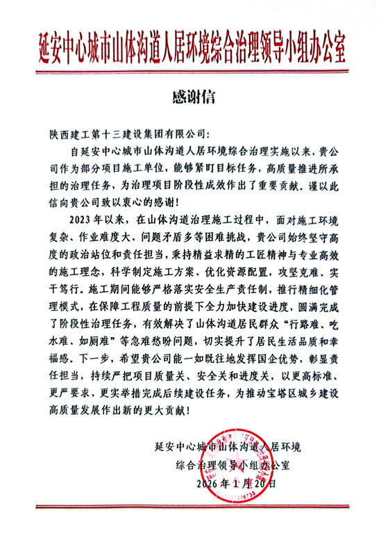 1月20日,延安市中心城市山體溝道人居環(huán)境綜合治理領(lǐng)導(dǎo)小組辦公室為集團(tuán)施工的山體溝道人居環(huán)境綜合治理工程成效發(fā)來感謝信。